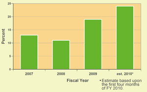 Federal prosecutors along the Southwest border with Mexico — many already strained by the rise in their immigration caseloads — are facing a new challenge: how to handle a sharp jump in drug cases. Justice Department data analyzed by the Transactional Records Access Clearinghouse (TRAC) show that during the first four months of FY 2010 drug cases in this region had surged by almost a third (30 percent) from what they were just 16 months ago and were up by 7 percent over levels at the end of FY 2009. This sharp regional increase is in stark contrast with the national pattern where drug prosecutions for the rest of the country have been steadily declining for a number of years, with the first four months of FY 2010 down by 17 percent since FY 2008 and down 12 percent from last year. Counts for the prosecution of drug offenses along the border, as well as detailed numbers for each of the five federal judicial districts involved, are given in Table 1.