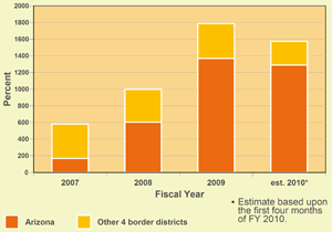 Different Patterns Along the Border: Among the five border districts, the highest growth rate has occurred in Arizona, recently in the news when a rancher allegedly was killed by drug smugglers. In the federal district courts in Arizona the pace of criminal prosecutions for drug offenses has jumped by 36 percent this year over last year, and is up 202 percent since FY 2008 (see earlier Table 1).