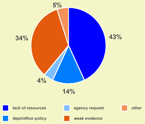While federal prosecutors under law and custom have for many years independently reviewed all referrals to decide whether they warranted prosecution, and turned down cases where they believed the evidence was inadequate, the reasons cited by federal prosecutors in Arizona tell a very different story. Figure 3 displays the reasons cited by Arizona prosecutors for declining to prosecute the 1,368 suspects during FY 2009 — the most recent year for which 12 months of data are available. The most common reason federal prosecutors cite is the lack of prosecutorial or investigative resources available to their office for handling the matter. This was the reason given for 43 percent of the turndowns. (All but 10 of the 589 cases turned away cited lack of prosecutorial resources; the remaining 10 cited lack of investigative resources.) An additional 14 percent were turned down because of department or office policy. Together these explain the majority of all turndowns. In contrast, only in one third (34 percent) was "weak or insufficient admissible evidence" cited as the rationale.