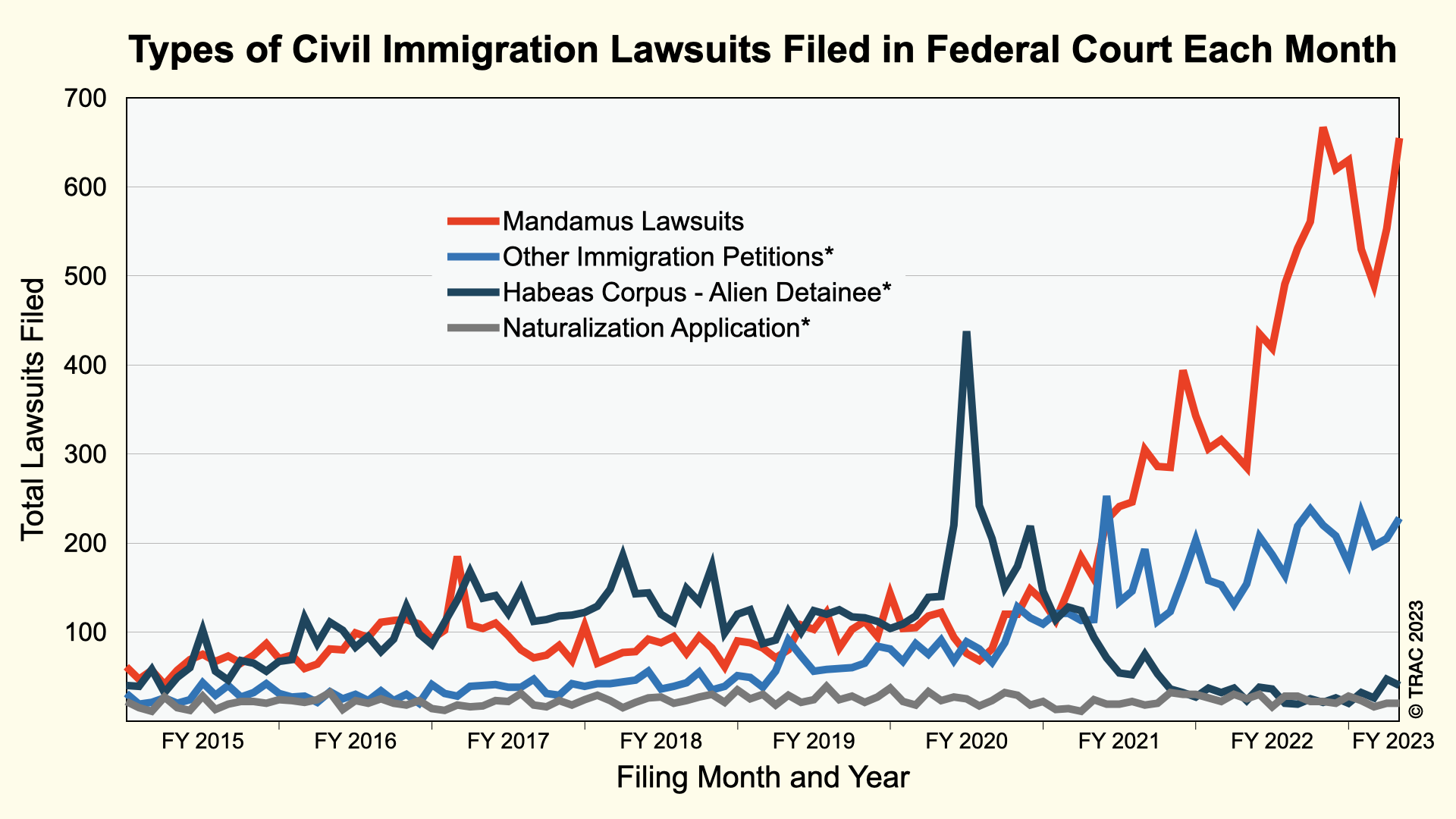 | Fiscal Year | All Civil Immigration Filings | Mandamus Lawsuits | Other | Percent Mandamus |